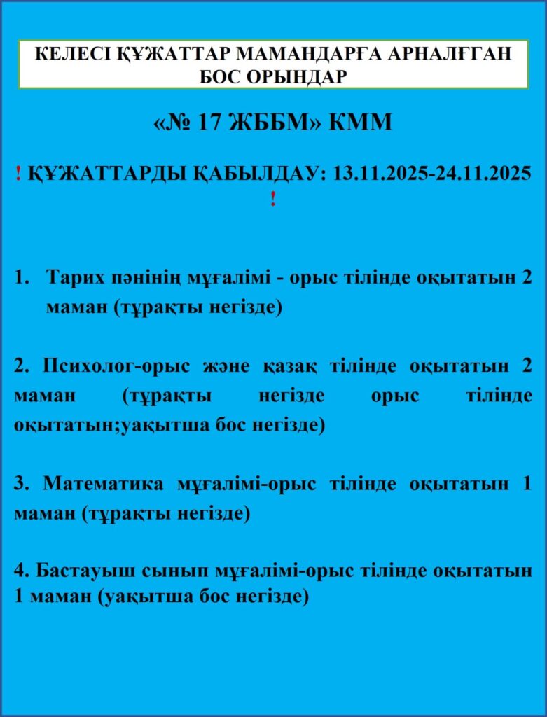 БайқауҚараша 19, 2025 Құжаттарды қабылдау 13.11.2025 ж. бастап 24.11.2025 ж. дейін жүргізіледі Конкурсқа қатысу үшін құжаттар сілтеме бойынша өтуі керек (hr-nobd.iac.kz) жеке ЭЦҚ кілтімен тіркелу. Leave a Reply Cancel replyYour email address will not be published. Required fields are marked *Name * Email * Website Comment * Save my name, email, and website in this browser for the next time I comment.