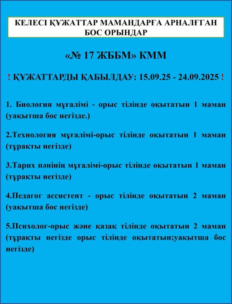 АГОО МОУО “№17 жалпы білім беретін мектеп” КММ бұйрық негізінде Қазақстан Республикасы Білім және ғылым министрінің 2025 жылғы 31 наурыздағы № 57 және Қазақстан Республикасы Еңбек және халықты әлеуметтік қорғау министрінің 2025 жылғы 31 наурыздағы № 96 бірлескен бұйрығы. Қазақстан Республикасының Әділет министрлігінде 2025 жылғы 31 Наурызда № 35900 болып тіркелді 2025-2026 оқу жылына келесі бос лауазымдарға конкурс өткізу туралы хабарлайды.