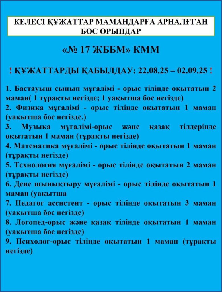 Құжаттарды қабылдау 22.08.2025 ж. бастап 01.09.2025 ж. дейін жүргізіледі