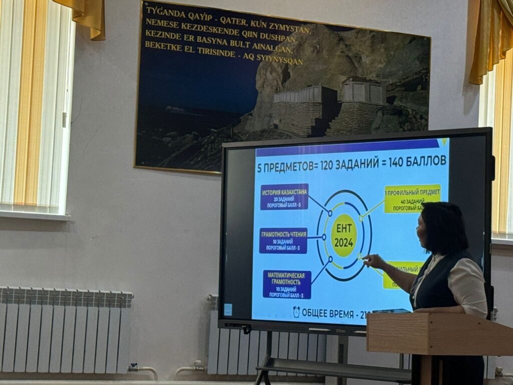 11 сынып оқушыларына таңдау пәндер комбинациялары туралы ,шектік балл, ұбт ережелері ,дайындық туралы,ұбт-ға өтініш беру,ұбт форматы,тестілеу тапсырмаларының нысаны туралы жете тоқталып түсіндірді.ҰБТ-ның мерзімі,грант уақыты,ҰБТ кезіндегі тәртіп,артық заттарды апармау т.б